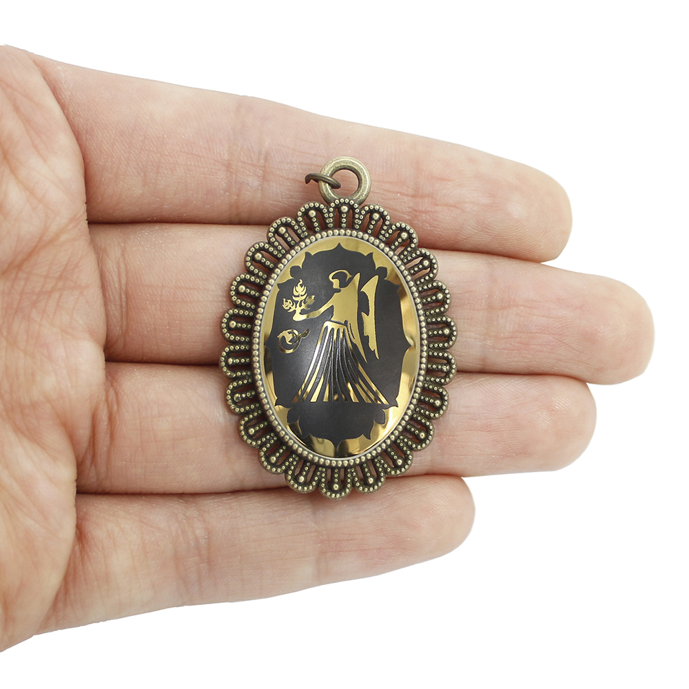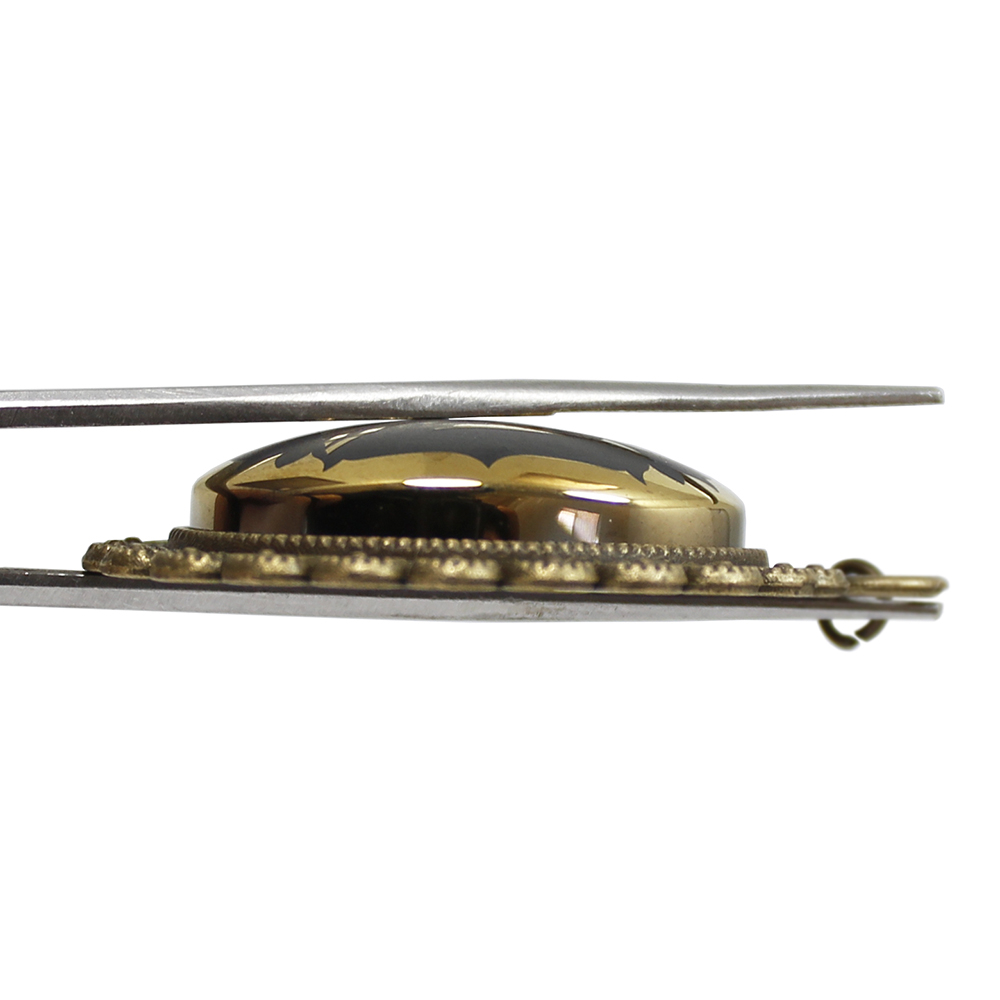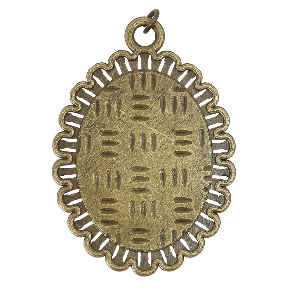 سنگ این آویز حدید است ، به رنگ مشکی و طلایی می باشد ؛ که با رکابی از جنس فلز است و برنزی رنگ است .